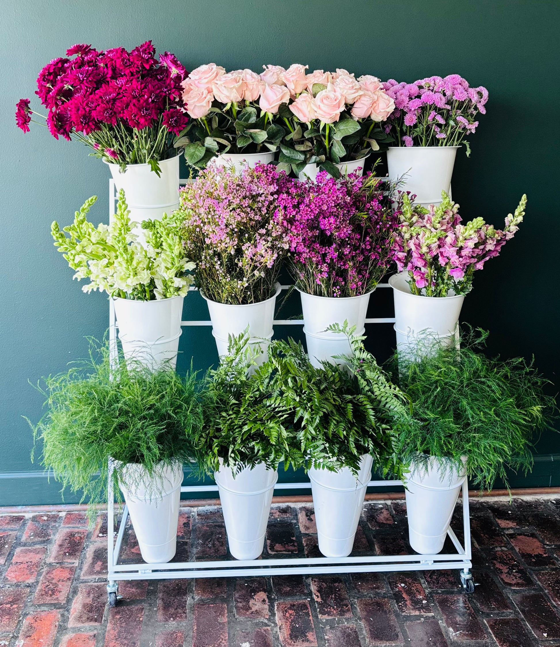 The bouquet bar is an interactive, DIY floral station where guests select, arrange, and wrap their own bouquets. It's both an engaging activity and a memorable party favor for weddings, bridal showers, corporate events, parties, and more. You choose the seasonal flowers, foliage, and fillers for your event. We deliver them arranged in buckets, along with wrapping paper, ribbons, and scissors.